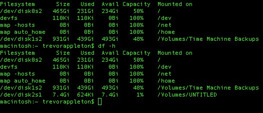You should now be able to compare the first and second instances of df -h. As you can see I now have an additional drive /dev/disk2s1 connected to my Apple Mac.